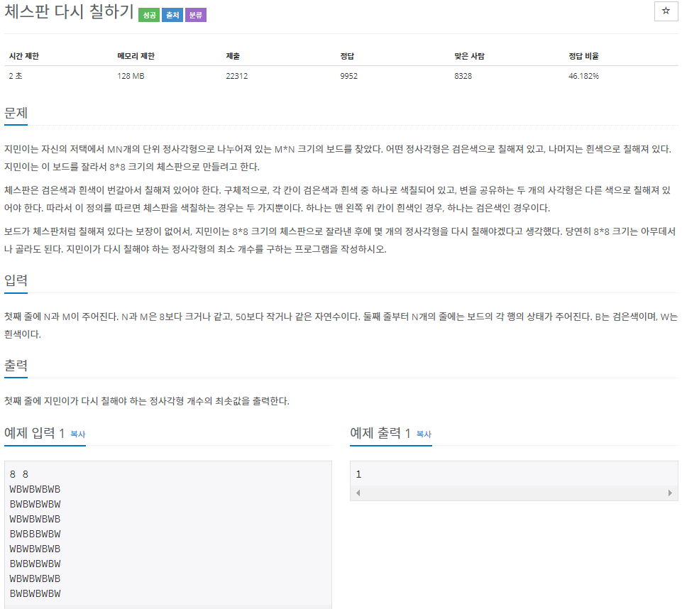 그렇다면 잘려진 판에서 맨 처음이 흰색으로 시작하는 체스판 그리고 검은색으로 시작하는 체스판 각각의 비용을 비교해 더 작은 값이 최소 값이 된다.