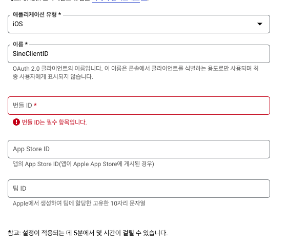 Xcode에서 확인한 Bundle Identifier를 번들 ID로 입력합니다.